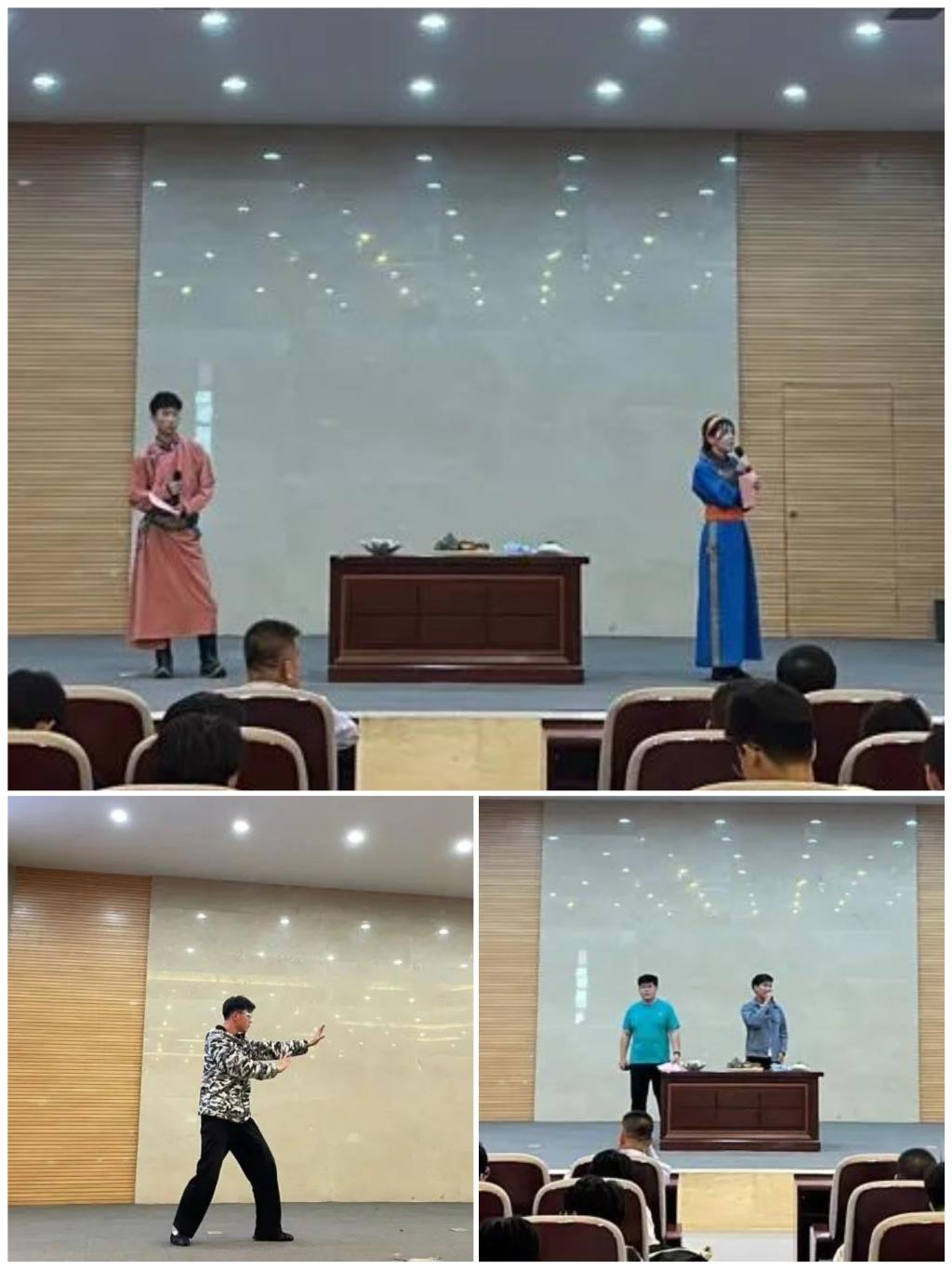 本次活动在民族服饰走秀中拉开序幕,同学们身着汉族、蒙族、苗族、藏族等民族服饰进行展示,旁白解说各民族服饰特点,让观众们感受到民族服饰的魅力的同时也加深了对不同民族的文化背景和发展历史的了解。蒙古族歌曲《女人的命运》,大屏幕上播放着蒙古族姑娘出嫁的视频,让现场师生仿佛身临其境。节目丰富多彩,有古典舞《簪花记》、中国剪纸和书法展示、马头琴演奏《美丽的草原我的家》、国术散手八卦掌和蒙古族博克的演示。还进行了各民族饮食文化的介绍,现场的师生共同品尝了奶茶、月饼、粽子等各民族特色美食。此次文艺展演在全场师生大合唱《相亲相爱一家人》中圆满落幕。