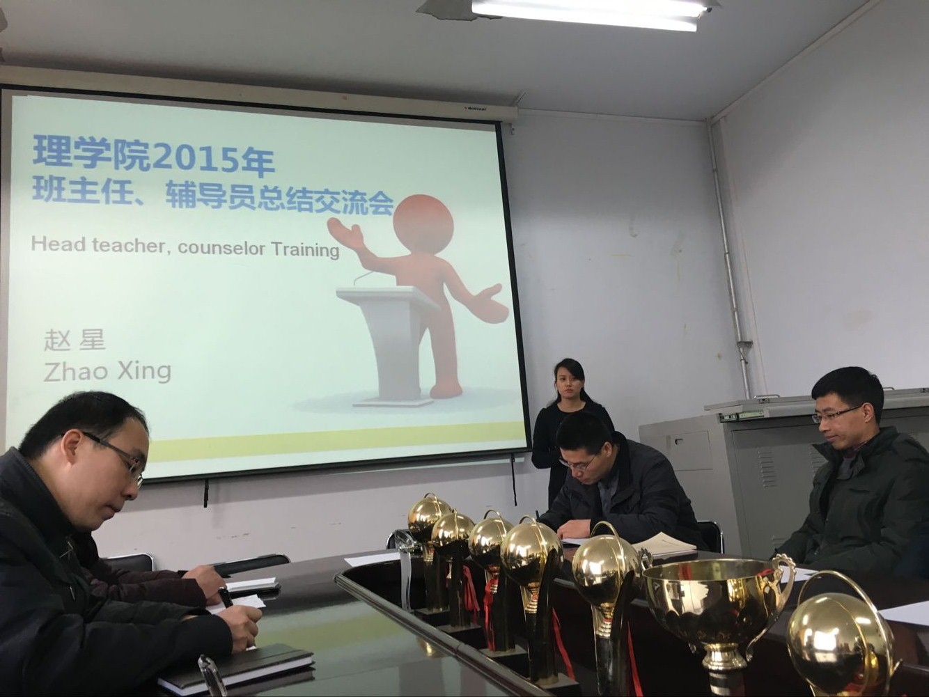 12月24日下午4时,yl23455永利集团在实验楼505会议室召开了班主任、辅导员工作培训交流会。此次培训交流旨在贯彻落实中共中央办公厅《关于进一步加强和改进新形势下高校宣传思想工作的意见》和教育部颁布的《普通高等学校辅导员队伍建设规定》,进一步加强大学生思想政治教育,规范学生管理,提升班主任、辅导员业务能力。会上,每位班主任都对自己本学期所做的工作进行了总结,交流了自己的工作心得、特色做法和对学生教育管理的意见建议。会议由院党委副书记、副院长赵星主讲。