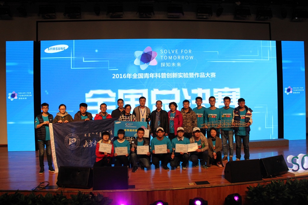 2016年12月22日,“SOLVE FOR TOMORROW探知未来2016年全国青年科普创新实验大赛”总决赛在中国科学技术馆举行。来自全国各地的54支参赛队伍在复赛中脱颖而出,齐聚北京进行最后的比拼。经过一天的激烈角逐,最终我校6支队伍均收获了不俗的成绩,并在本次大赛中荣获优秀组织奖。