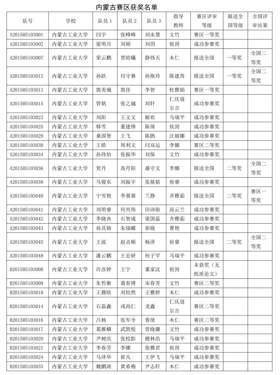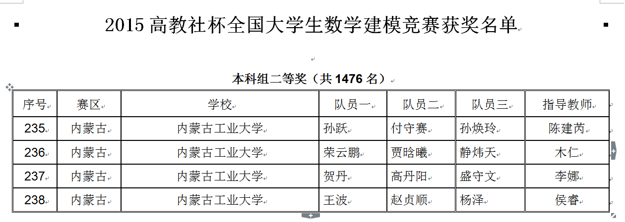 近日,从2015高教社杯全国大学生数学建模竞赛组委会获悉,我校取得优异成绩。经赛区组委会初评、全国大学生数学建模竞赛组委会复评、公示期无异议,我校yl23455永利集团侯睿、陈建芮、李娜和管yl23455永利集团木仁四位老师指导的参赛队均获得本科组全国二等奖的好成绩(四组中有三组为我院学生),此外还获得内蒙古赛区一等奖三项,二等奖四项,成功参赛奖若干。
