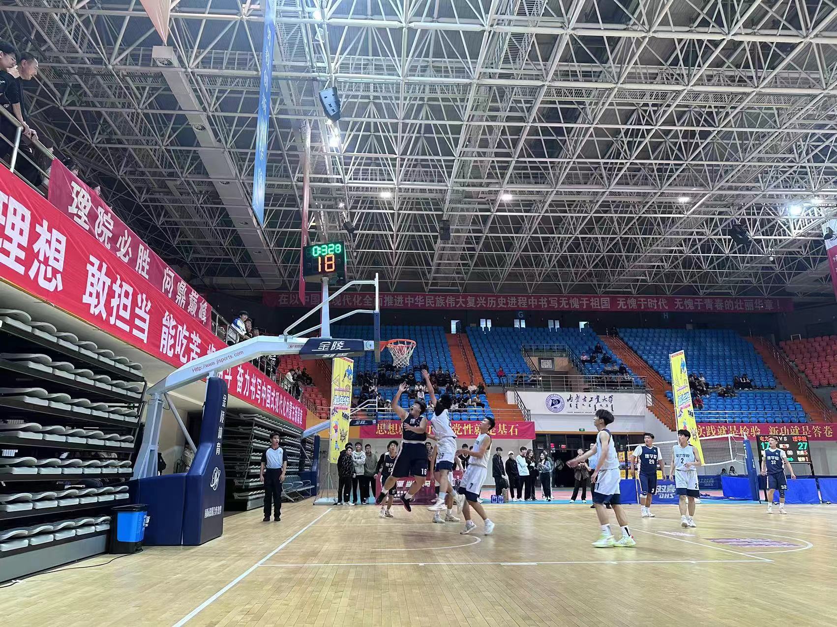 本届比赛以学院为单位,竞争激烈,我院男女篮经小组赛、半决赛最终杀入决赛。决赛中,女篮顽强拼搏,在最后一秒完成绝杀,以16:15战胜土木学院女篮,赢得冠军。男篮以全胜战绩进入决赛,在比赛中队员之间传球默契、配合完美,最终以47:26大比分战胜电力学院男篮,取得冠军。2023级全体新生到场为队员们加油助威,大家情绪高涨,呐喊声充斥着整个球场。