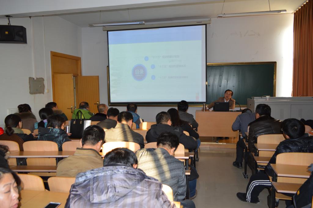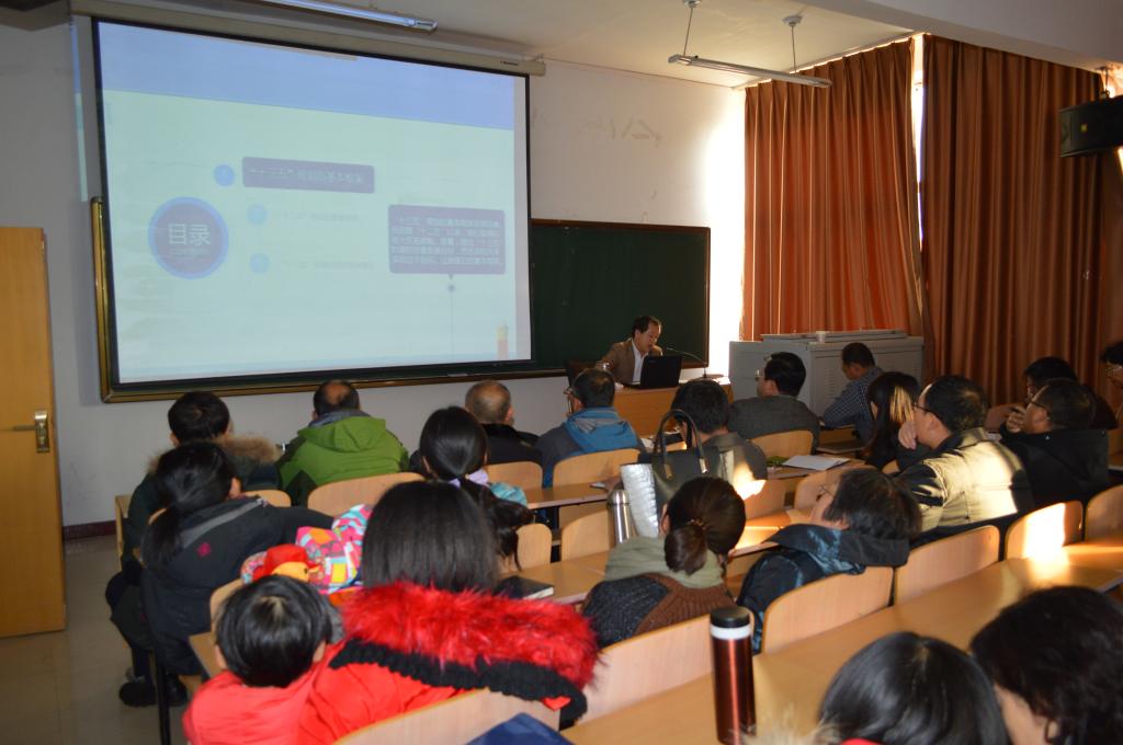 为贯彻落实党的十八届五中全会精神,根据校党委“10+3”活动方案要求,11月26日下午,yl23455永利集团党委举行学习党的十八届五中全会形势政策报告会,邀请马克思主义学院布和朝鲁教授作题为“‘十三五规划建议’的基本框架和逻辑体系”的宣讲报告。院党委书记曙光,院长庞晶,副书记、副院长赵星及全体教工和学生党员聆听报告。曙光主持报告会。