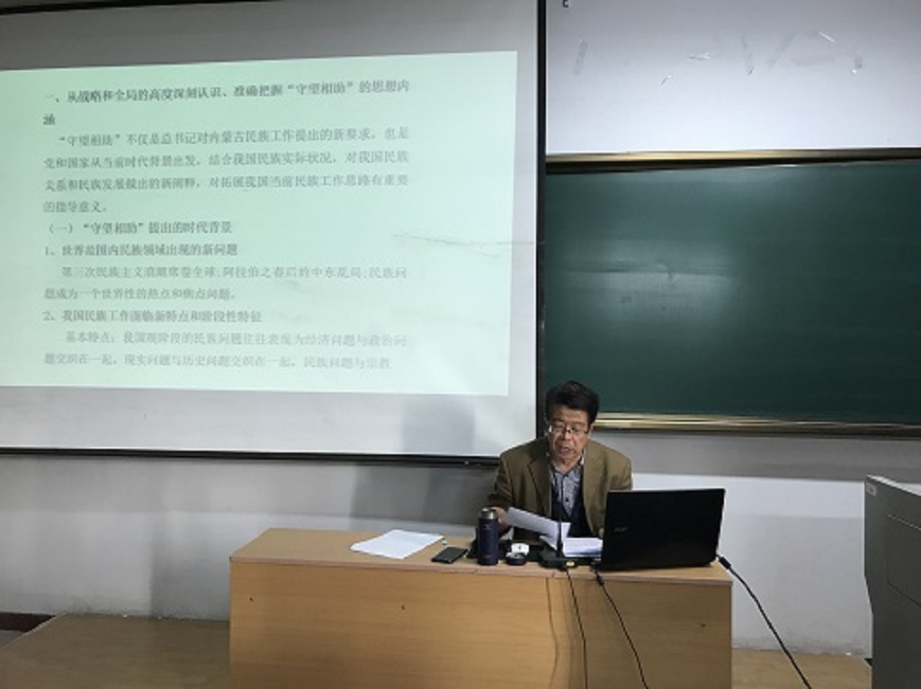 黄龙海结合当今国际国内形势以及中国共产党党史,以生动的语言、鲜活的事例讲解了“守望相助”提出的时代背景、深刻思想内涵及历史意义,并对如何深刻理解、准确把握总书记提出的“四个着力”重点任务进行了阐述。他指出,习近平总书记考察内蒙古重要讲话,既有要求,也有嘱托,既有部署,更有期待,情深意切,语重心长,为我们内蒙古的发展注入了强大的精神动力。我们必须从讲政治的高度,认真学习深刻领会讲话精神,进一步树牢政治意识、大局意识、核心意识、看齐意识,坚持以党的旗帜为旗帜、以党的方向为方向、以党的意志为意志,自觉向党中央看齐,向党的理论和路线方针政策看齐、向党中央的决策部署看齐,更加自觉地在思想上政治上行动上同以习近平同志为核心的党中央保持高度一致,切实把习近平总书记对内蒙古发展的新指示新要求,落实到各项工作中去。