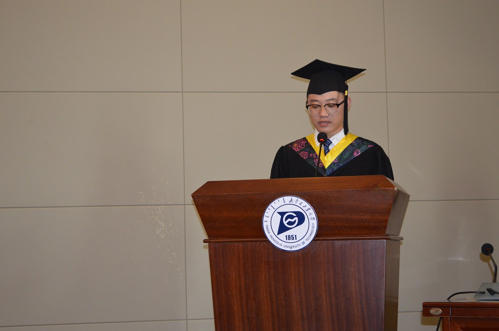 毕业生代表工程力学13级学生代冬阳代表全体毕业生讲话,讲话中表达了对母校深深的感谢,毕业班班主任付磊老师讲话希望同学们前程似锦。