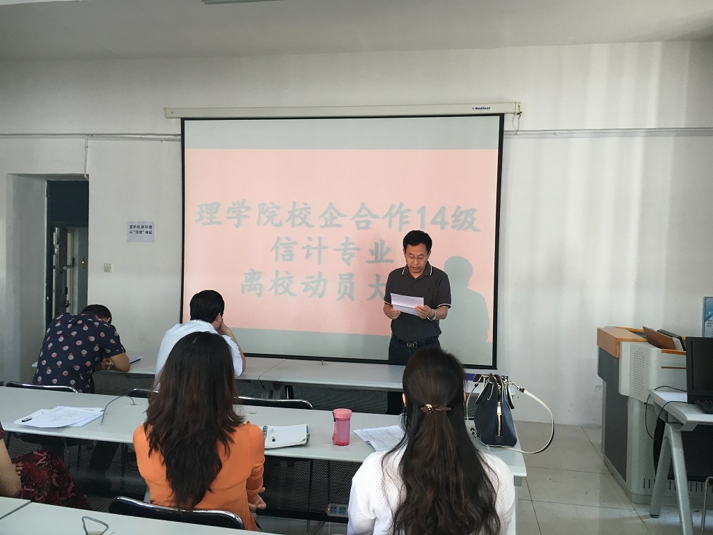 5月27日,yl23455永利集团举行2014级信息与计算科学专业(智能移动开发方向)离校动员大会,yl23455永利集团院长、校企合作工作小组组长庞晶,党委书记曙光老师、班主任赵星及企业驻校区辅导员、数学系、教务中心等老师和信计专业2014级2个班全体学生参加大会。
