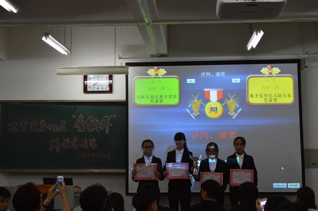 本届辩论赛从初赛复赛到决赛,历时一个半月时间,经过一场场激烈的唇枪舌剑,电科一班和信计二班两支代表队进入决赛。