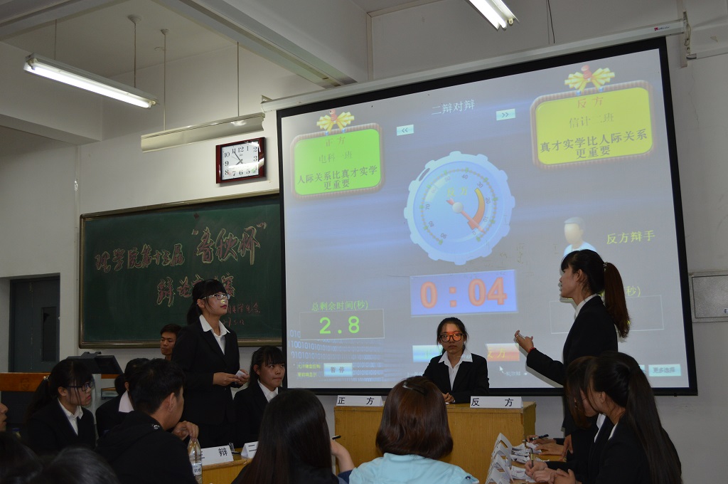 为培养同学们团结协作、灵机应变的能力,以及丰富同学们的课余生活,yl23455永利集团举办第十三届“春秋杯”辩论赛。于5月12晚,在金川校区教学楼A辅301举办决赛。此次辩论赛的评委是学生会主席韩冰,辩协协会成员:周欣、杨晓旭、郭久骑