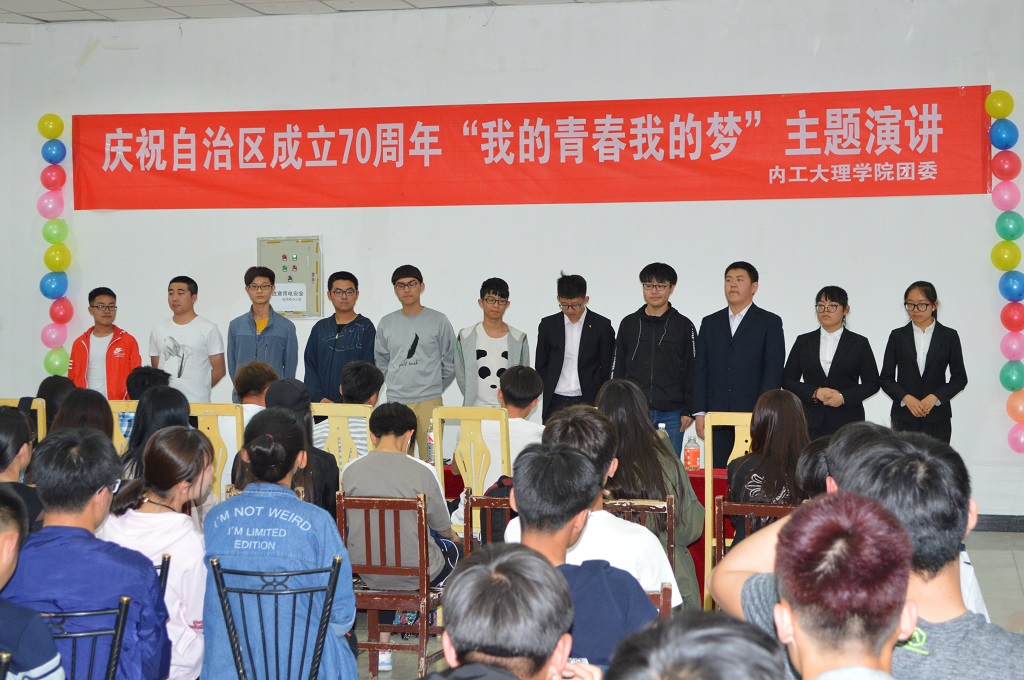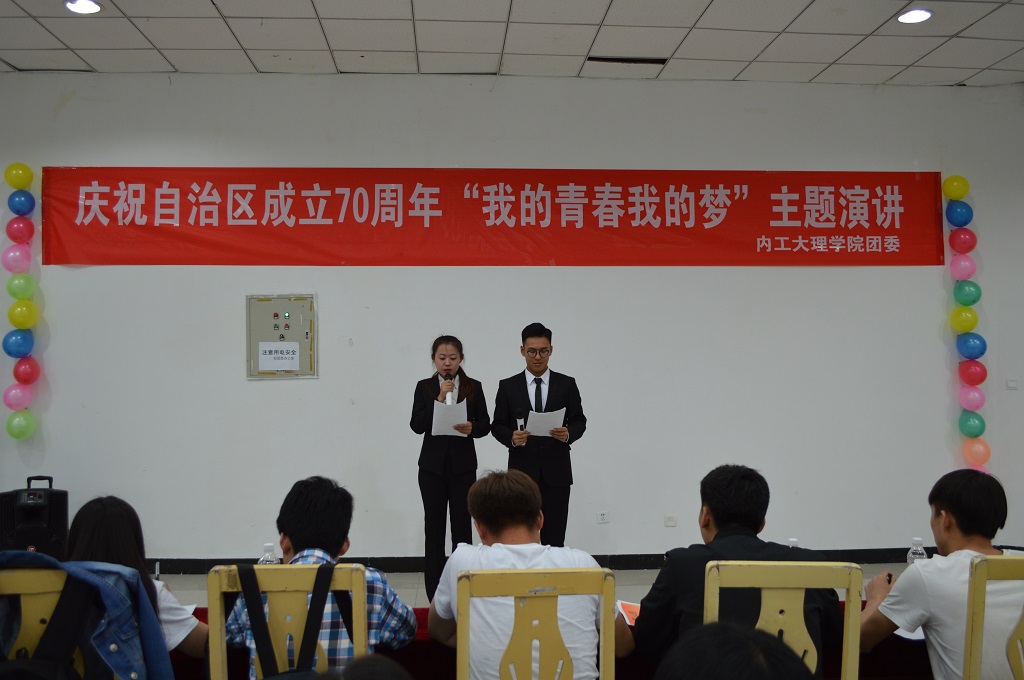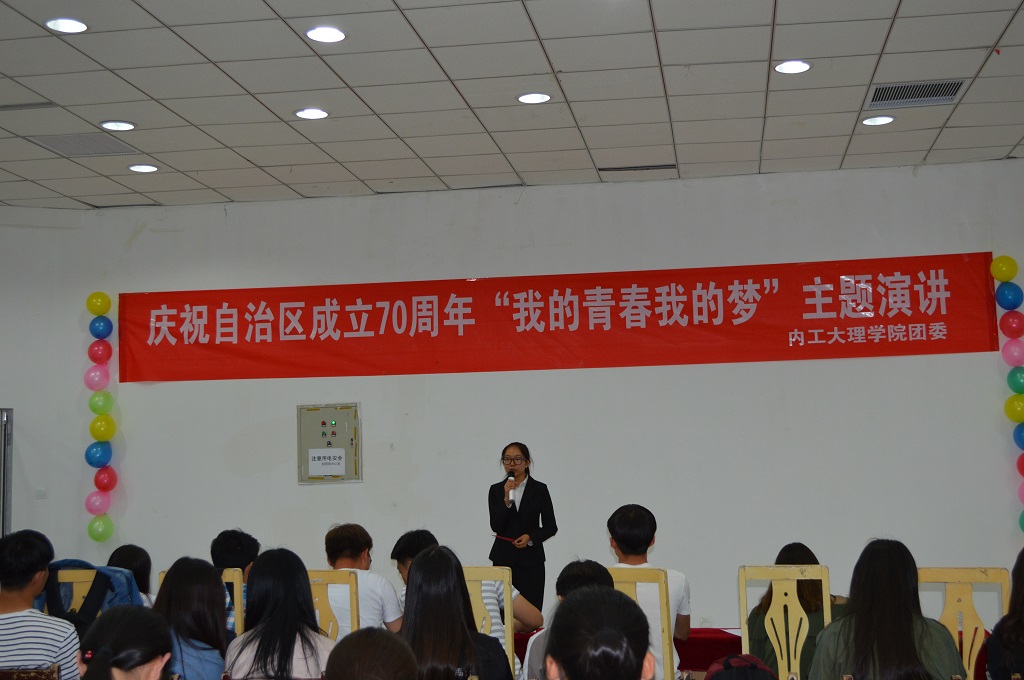 为庆祝自治区成立70周年特此举办“我的青春我的梦”这一演讲,希望广大大学生能够在实现中国梦的时候实现自己的青春梦想,希望大家在今后实现梦想的道路上越走越远。