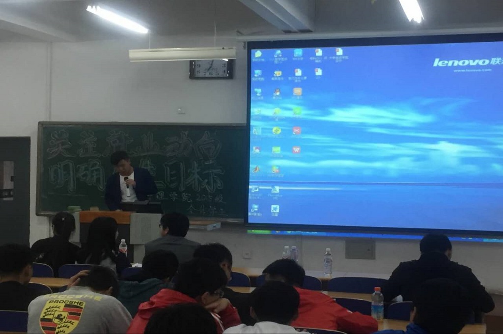 2015级学生周欣、吴志浩、韶华森、闫瑞成四位同学分别以“大学生如何有意思渡过”、“如何能顺利毕业”、“我们为什么要读书”、“两会中关于就业问题的解读”四个题目与大家学习分享。