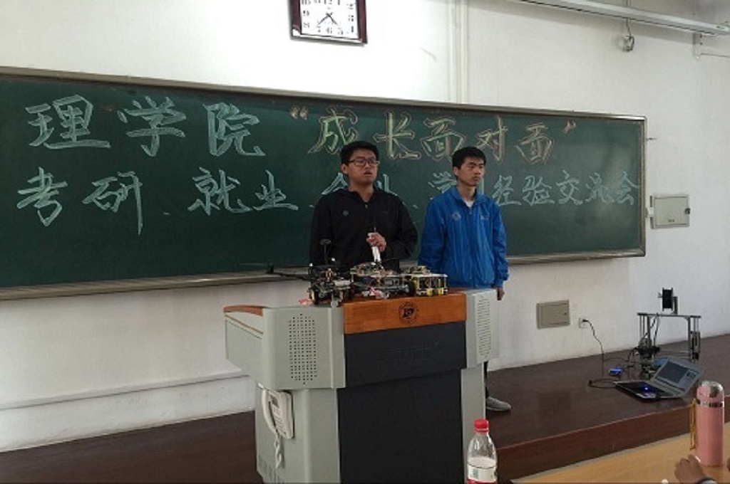 2015级学生徐宏健、徐辰宇分别给同学们演示了自己研制的“3D打印机”、“无人机”、“循环小车”。