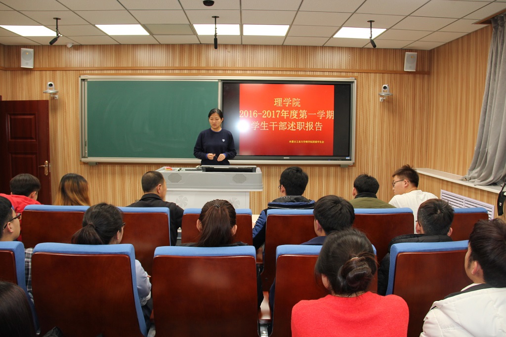 在本次报告上,全体学生干部分别进行述职报告,总结本学期工作的完成情况,并对下学期的工作进行计划和安排。最后,由团委书记董元老师,进行总结,说到:“今天的述职报告是对半个学期工作的总结。就像习近平总书记说的那样“挽起袖子,就是干”。但是你们在干的过程中有没有想过,为什么干,意义和目的又是什么。你们是在为谁辛苦为谁忙”。会后,学生干部参加互评并填写互评表。