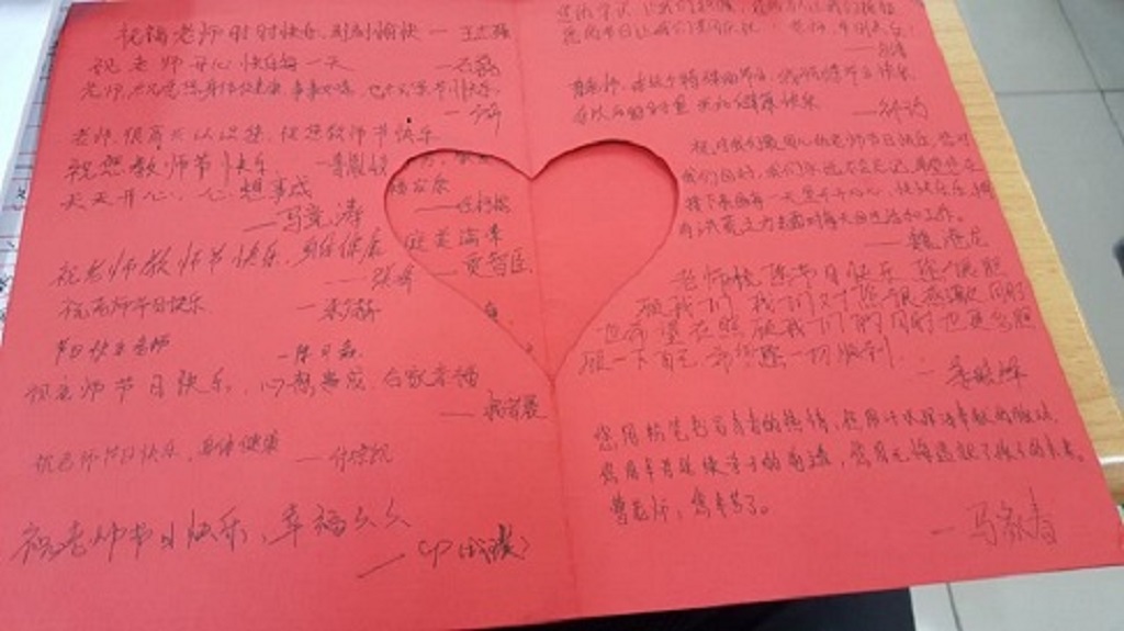在教师节期间,yl23455永利集团组织开展以“感念师恩,最想对老师说的话”为主题的送祝福活动,教育引导学生学习教师身上展现出的优秀师德,感谢教师在教书育人中的无私奉献,感念师恩、感谢学校,在青年学生中营造崇敬老师、爱戴老师和感恩老师的良好氛围。9日上午,在曹艳老师进入教室时,惊讶地发现同学们在黑板上写下“老师您辛苦了”,并由学生代表送上同学们手工制作的贺卡。曹老师对此特别欣喜,在向同学们表示感谢之余也对同学们给与了谆谆教诲。