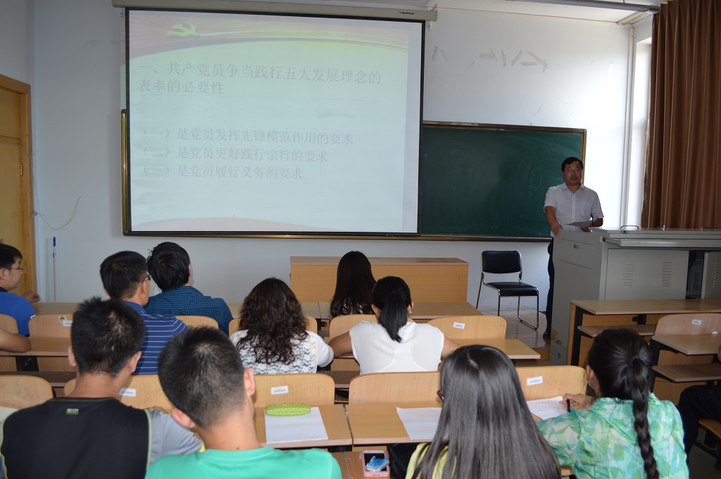 仪式之后,学院党委书记曙光同志为党员们以《共产党员要争当践行五大发展理念的表率》为题进行了专题讲座。讲座从共产党员争当践行五大发展理念的表率的必要性、共产党员要争当哪“五大表率”、共产党员践行五大发展理念的基本要求等三个方面入手,深入阐述党的十八届五中全会通过的《关于制定国民经济和社会发展第十三个五年规划的建议》(简称《建议》)指出:实现“十三五”时期发展目标,“必须牢固树立创新、协调、绿色、开放、共享的发展理念”。五大发展理念是全面建成小康社会的行动指南,广大共产党员要争当践行五大发展理念的表率,为决胜全面建成小康社会而奋斗。