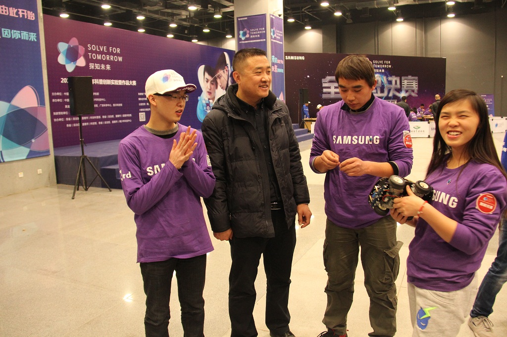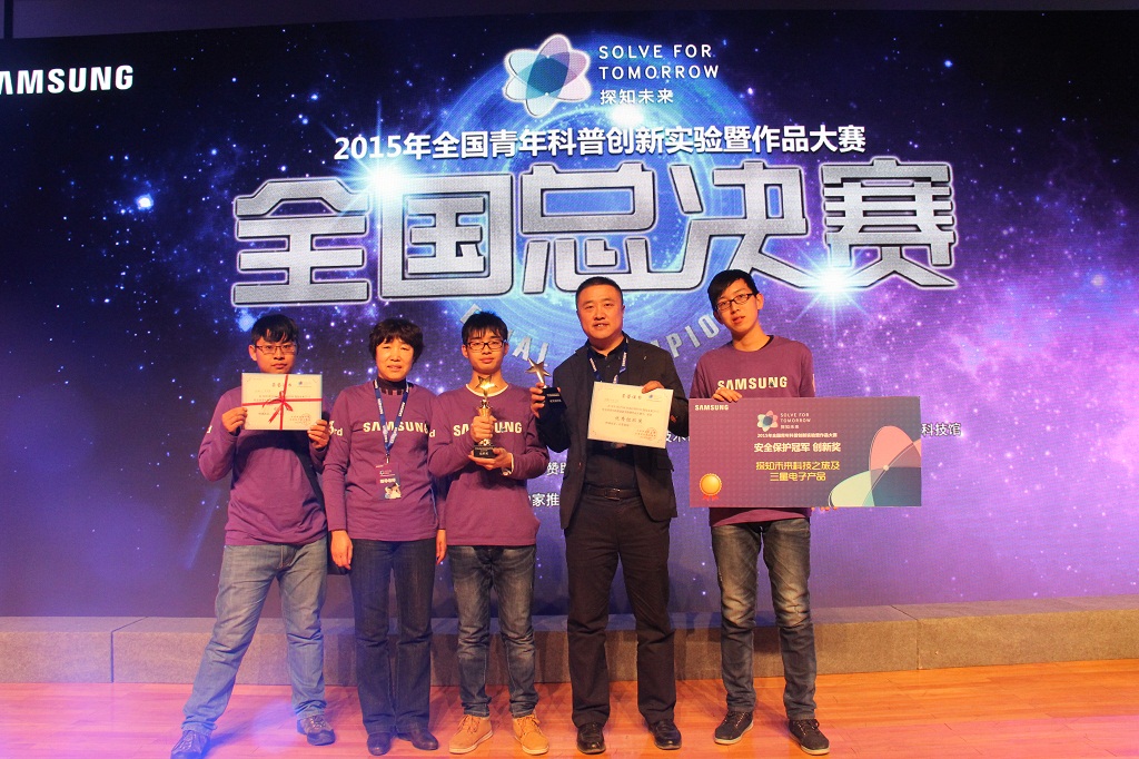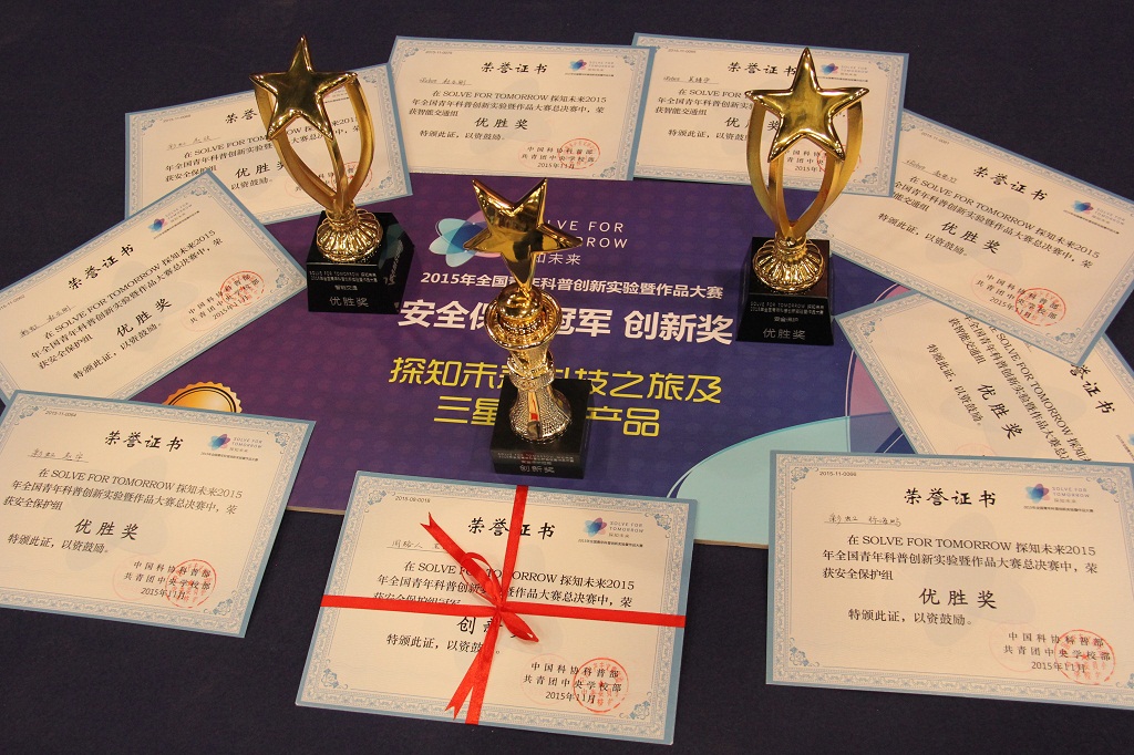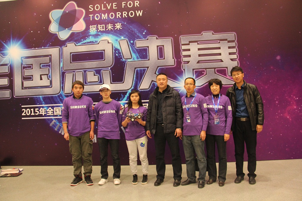 11月27日,由中国科协科普部和共青团中央学校部共同主办的“SOLVE FOR TOMORROW探知未来2015年全国青年科普创新实验暨作品大赛”迎来终极对决。47支来自全国高中、高校的参赛队伍齐聚中国科技馆展开激烈比拼。最终,我校杨仕林、崔剑、王世良组成的“同路人”队获得“安全保护命题”冠军,赢得赴韩参观三星总部的科技之旅机会和三星电子产品礼包;赵宇、弥海鹏、赵欣组成的“彩虹”队获得“安全保护命题”第四名;吴靖宇、李仁杰、赵先竹组成的“iRobot”队获得“智能交通命题”第四名。刘闽华获得“优秀指导教师”称号。我校团委书记王武代表学校领取了优秀组织奖。