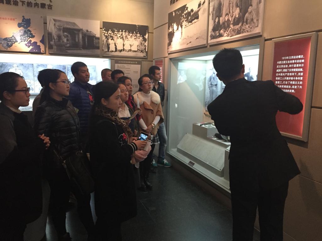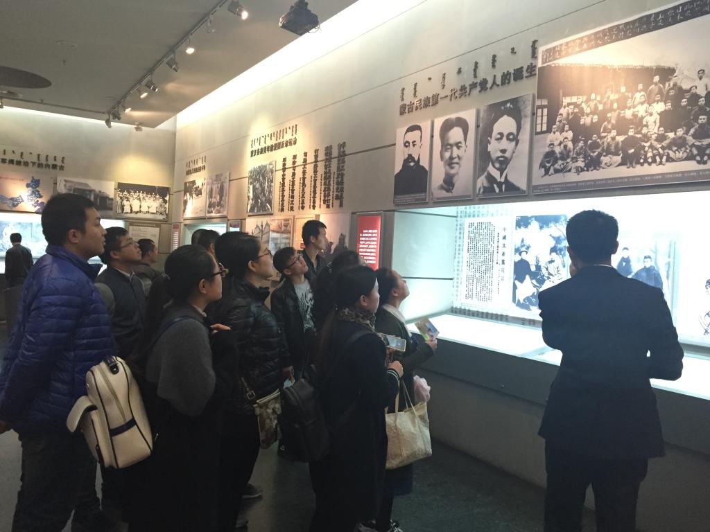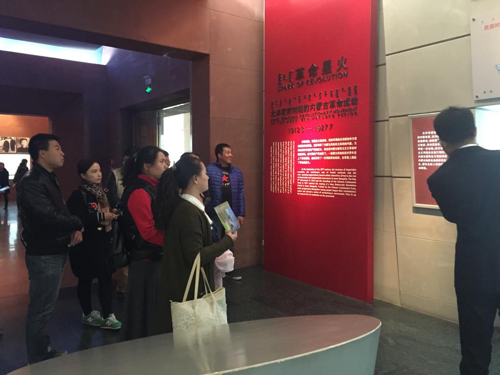 此次活动,在讲解员的带领下,我们着重参观了草原烽火、草原风情两个展厅。其中草原烽火是内蒙古现代革命斗争史陈列,展出自1919年五四运动至1949年中华人民共和国成立期间内蒙古的社会状况和革命文物,重点表现内蒙古各族人民在中国共产党的领导下,前仆后继,英勇悲壮又具民族特色的革命斗争史。草原风情是内蒙古近代民族风情陈列,展出近数百年来生活在内蒙古地区的蒙古、达斡尔、鄂温克、鄂伦春、满、回、朝鲜、汉等八个民族的生产生活、文化艺术、风尚礼仪、宗教信仰等风俗,积极弘扬民族优秀文化传统。大家在参观过程中仔细观看了一幅幅照片,一件件文物、一处处复原景观,对内蒙古的风土人情及其革命历程有了很深刻的认识。