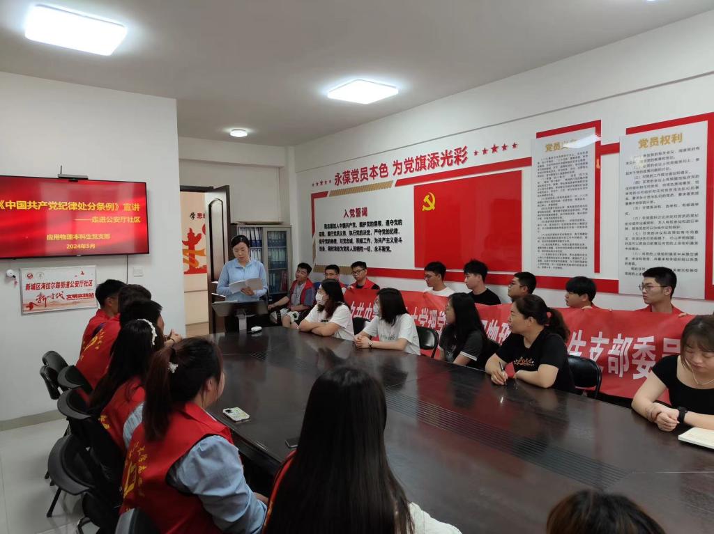 为扎实有效开展党纪学习教育,5月23日,学院党委所属应用物理本科生党支部走进公安厅社区,开展《中国共产党纪律处分条例》宣讲活动,应用物理本科生党支部书记刘洋主持并进行宣讲,公安厅社区党员和应用物理本科生党支部党员参与活动。