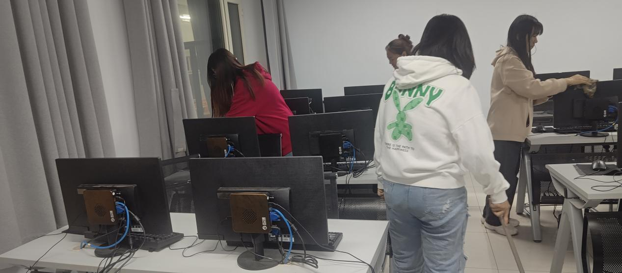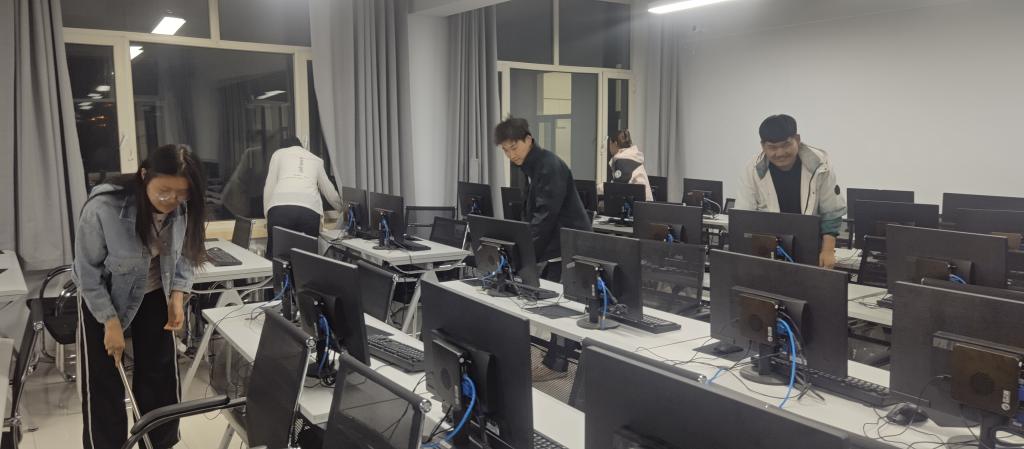 劳动内容:组织学生打扫实验楼3楼西过街楼机房并进行设备调试。